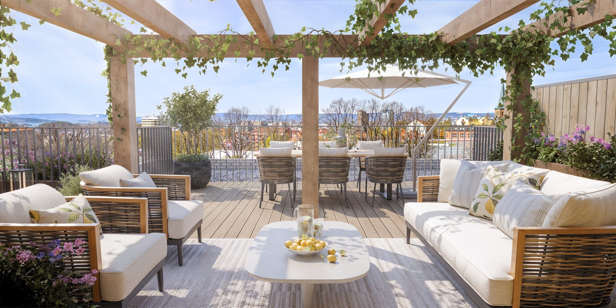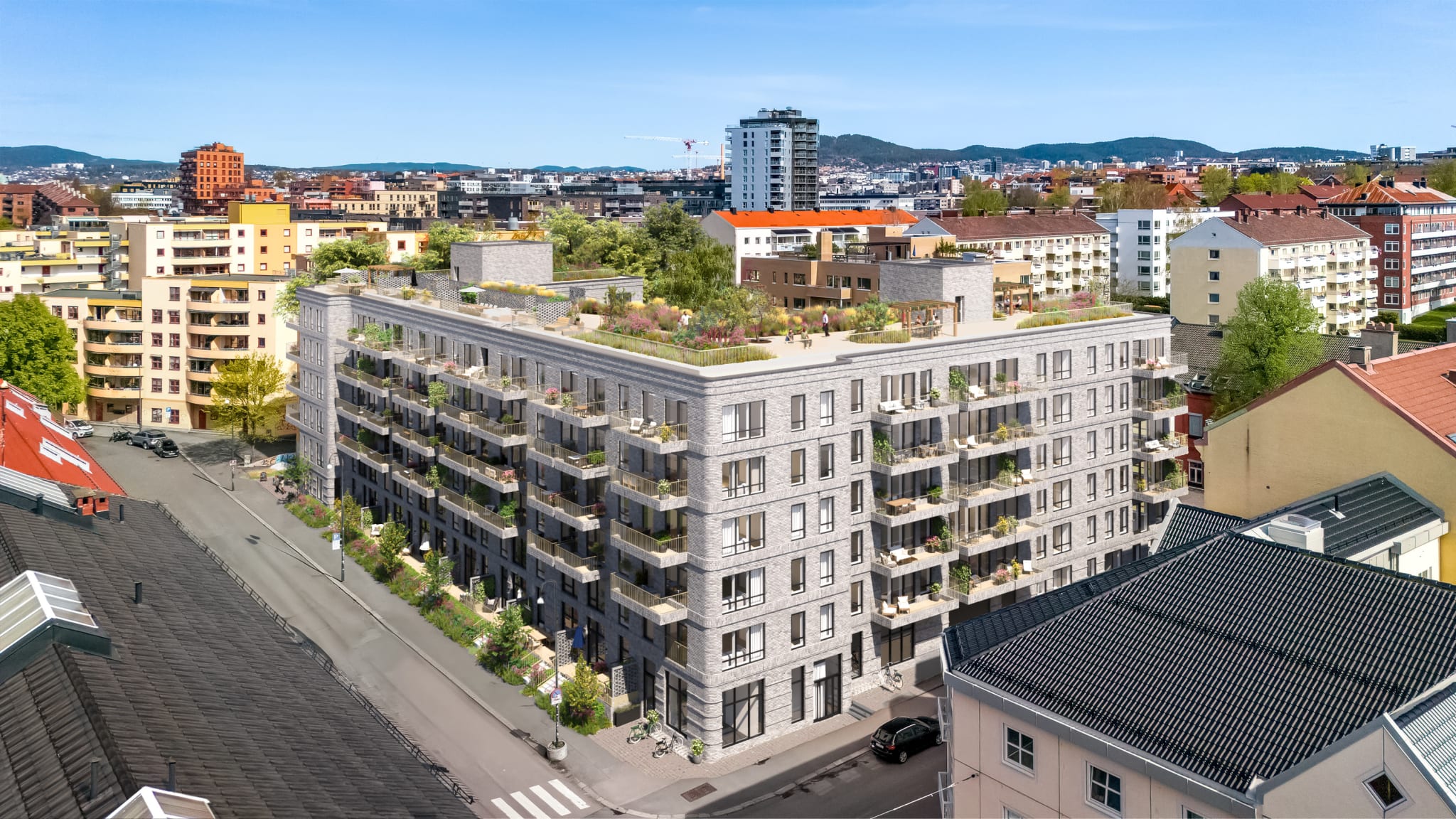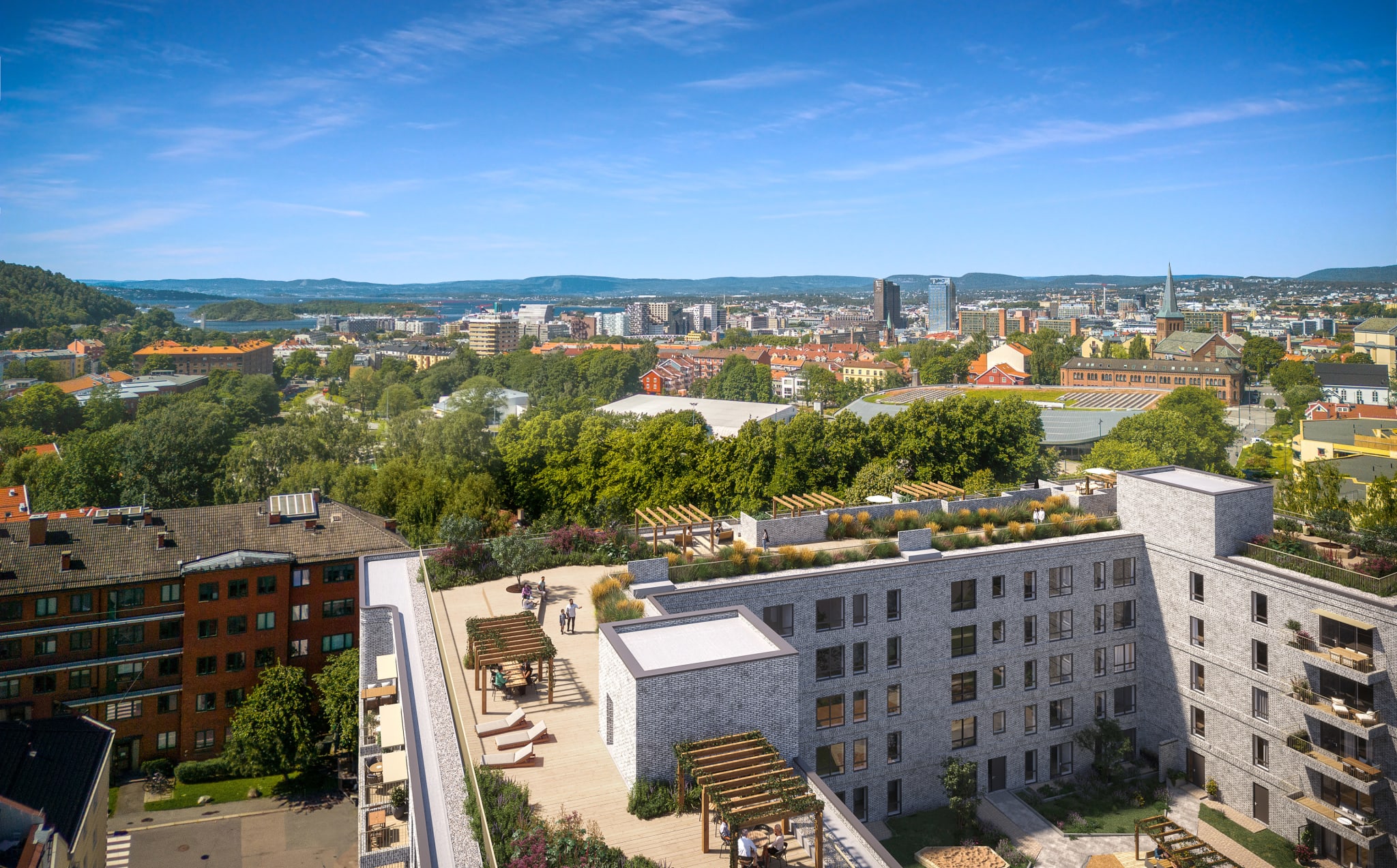 Kampenhagen tilbyr en fantastisk felles takterrasse som blir en grønn oase midt i byen. Her kan beboerne nyte solfylte dager omgitt av frodige planter og vakre skillevegger i flettet tegl. Takterrassen gir en imponerende utsikt over Jordal Amfi og nærområdet, og blir et perfekt sted for avslapning og sosiale sammenkomster. Med rikelig med sollys og grønne omgivelser, vil denne takterrassen være et yndet sted for alle som bor i Kampenhagen.