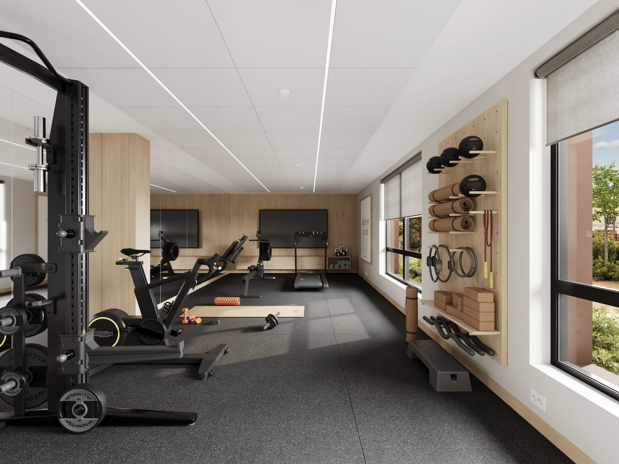 Trimrommet har store vinduer ut mot felleshagen, som gir en luftig og åpen atmosfære. Overflatene er lyse og innbydende. Sameiet vil få et bidrag til å kjøpe inn de apparatene de selv ønsker., slik at rommet best mulig dekker behovene til beboerne.