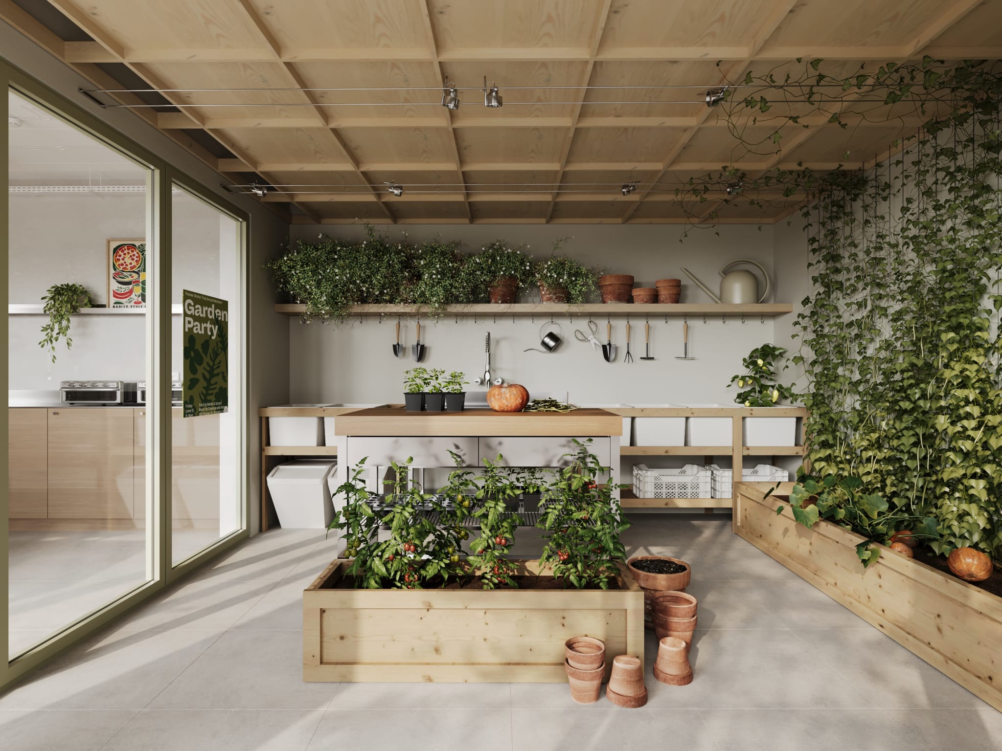 Lenger ned i felleshagen ligger et stort og innbydende vekstrom med tilknyttet orangeri. Her kan du potte om planter, dyrke egne urter eller bidra til felles grønnsaksdyrking. Store vinduer gir godt lysinnslipp, og rommet er designet for enkel bruk og rengjøring – med flislagt gulv, naturlige materialer og plassbygde furukasser for beplantning. En stor arbeidsbenk og utslagsvask gjør det praktisk å jobbe med jord og planter.